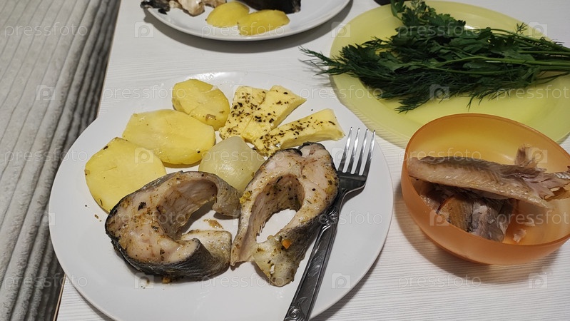 Кета запеченная с картофелем на тарелке с луком и сыром