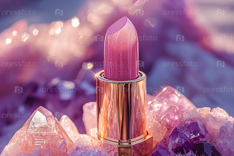 Роскошная розовая помада на фоне сияющих аметистовых кристаллов