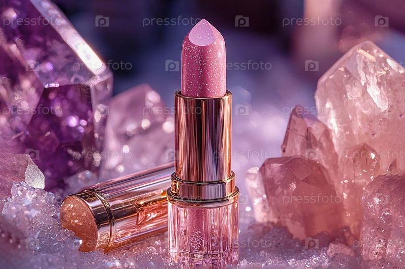 Роскошная розовая помада на фоне сияющих аметистовых кристаллов