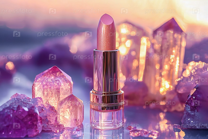 Роскошная розовая помада на фоне сияющих аметистовых кристаллов
