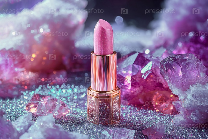 Роскошная розовая помада на фоне сияющих аметистовых кристаллов
