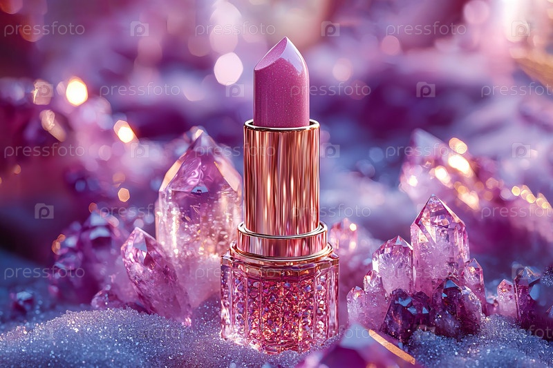 Роскошная розовая помада на фоне сияющих аметистовых кристаллов