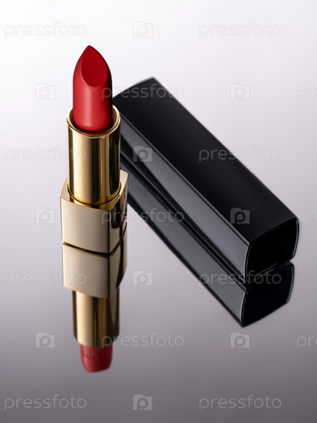 Красная помада на сером градиентном фоне. Модный аксессуар для макияжа, модный дизайн, модная презентация