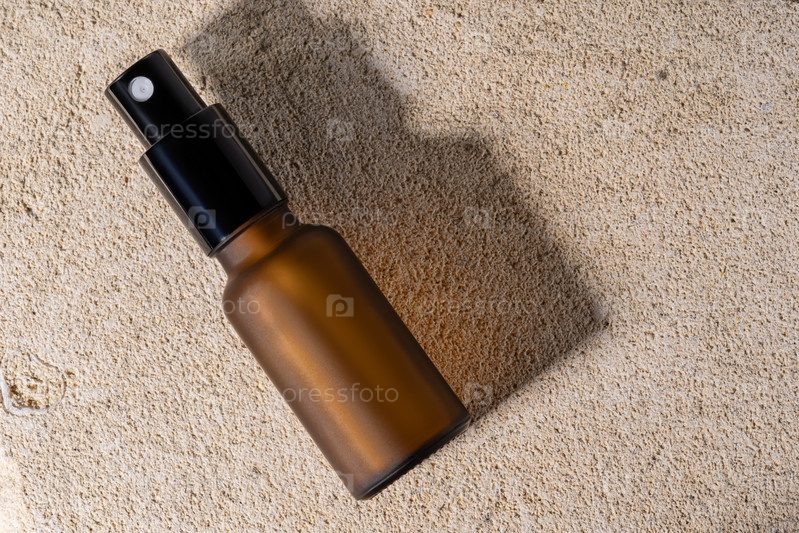 Бутылка из янтарного стекла с пустой этикеткой, крем на подставке из натурального камня на бежевом фоне. Макет натуральной органической спа-косметики. Минимальное эстетическое косметическое средство по уходу за кожей