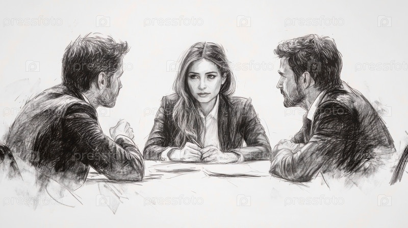 Деловые переговоры, женщина и двое мужчин в стиле карандашного наброска