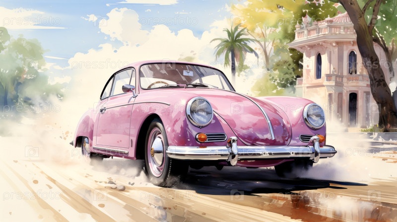 Акварельная живопись, розовый ретро кабриолет