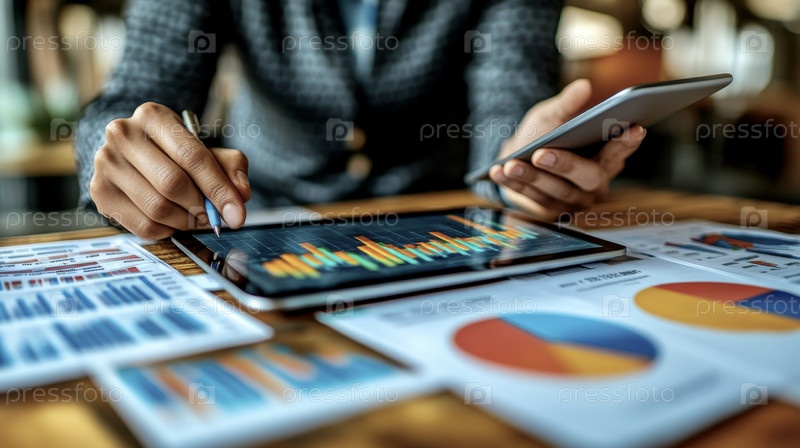 Крупный план рук бизнесмена с iPad в руке, наклонившегося над столом, на котором разложены графики и документы