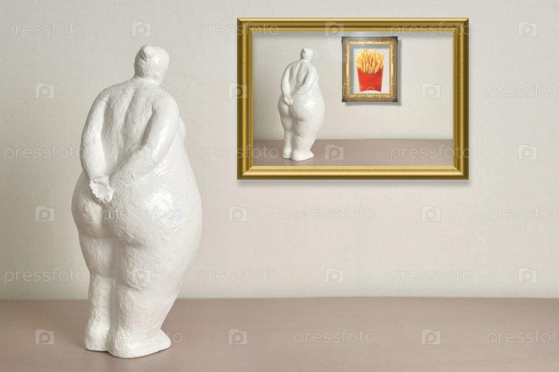 Белая скульптура пышнотелой женщины смотрит на фотографию картофеля фри в рамке, смешивая юмор с социальным комментарием о стандартах красоты и желаниях