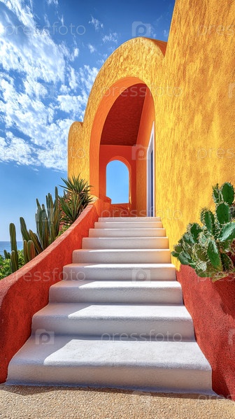 Минималистская архитектура, пустынный ландшафт, кактусы, смелые цвета, лестницы, ведущие наверх, геометрические фигуры, архитектурная фотография
