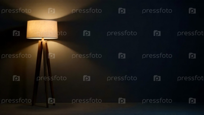 На темном фоне слева бежевый торшер. Правая сторона пустая, оставляя место для текста