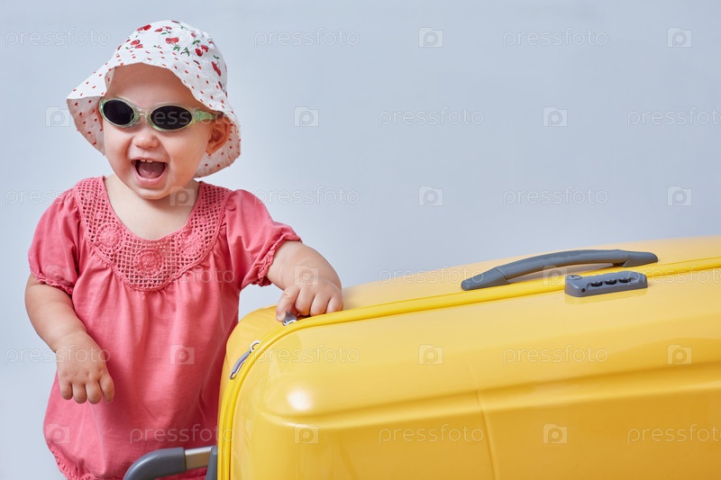 Портрет улыбающейся девушки с большим чемоданом в руках.Концепция путешествий и отдыха из copyspace