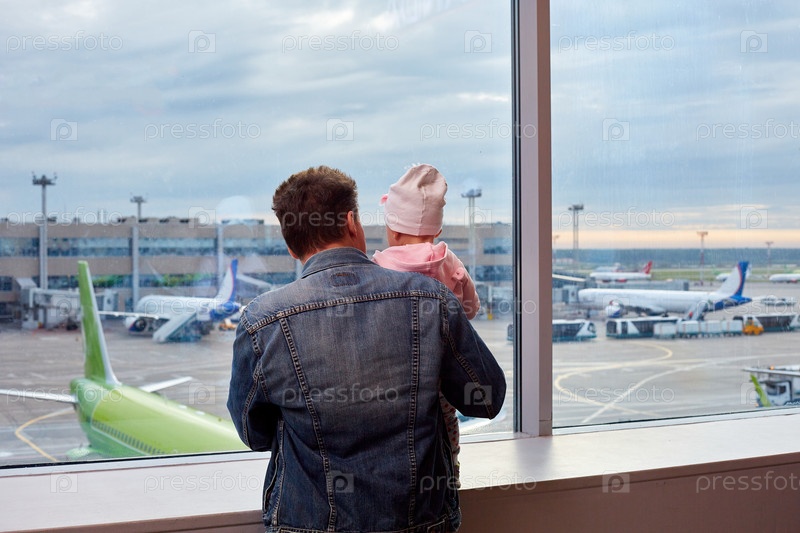 Люди в аэропорту. Мужчина и дочь смотрят в окно на самолеты