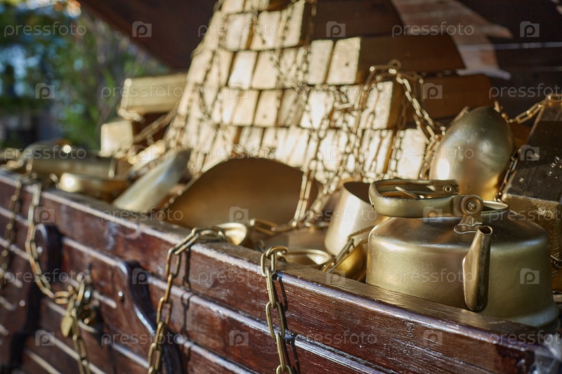 Откройте сундук с золотом. Золотой чайник, золотые слитки и золотые цепи