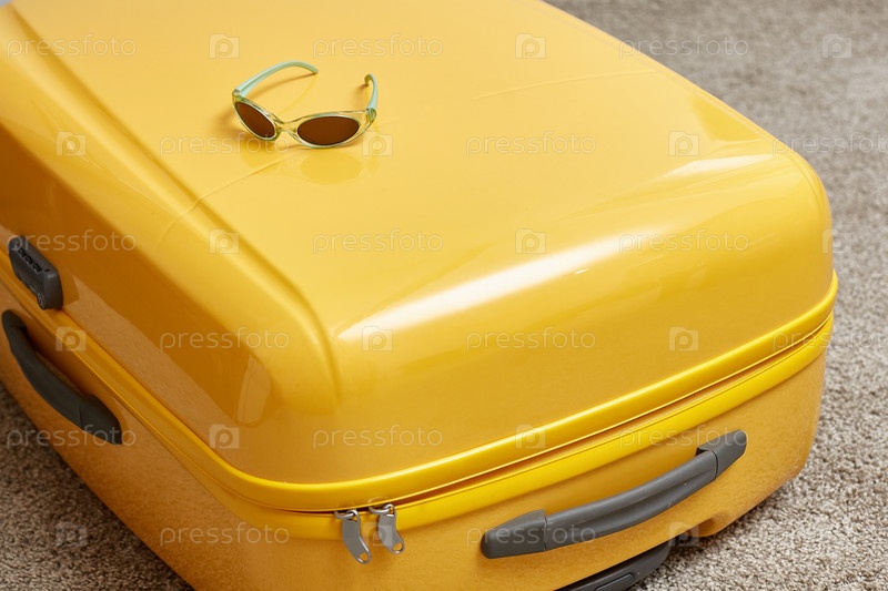 Крупный план большого желтого чемодана с солнцезащитными очками