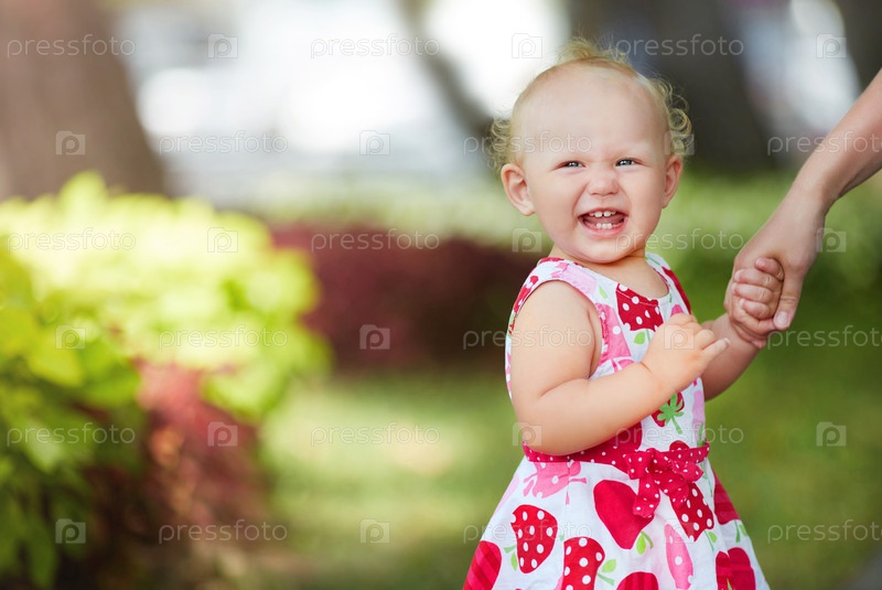 Маленькая девочка года-двух в разноцветном платье держится за руку взрослого и весело смеется