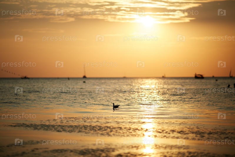 Чайка на волнах в море на фоне заката или рассвета