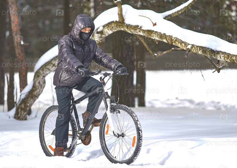 Зимние виды спорта. Велосипедные прогулки. Молодой человек в черной одежде едет на велосипеде