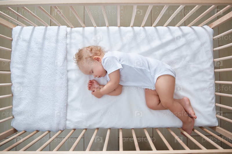 Малыш спит в кроватке. Вид сверху. Колыбель с младенцем в солнечный день