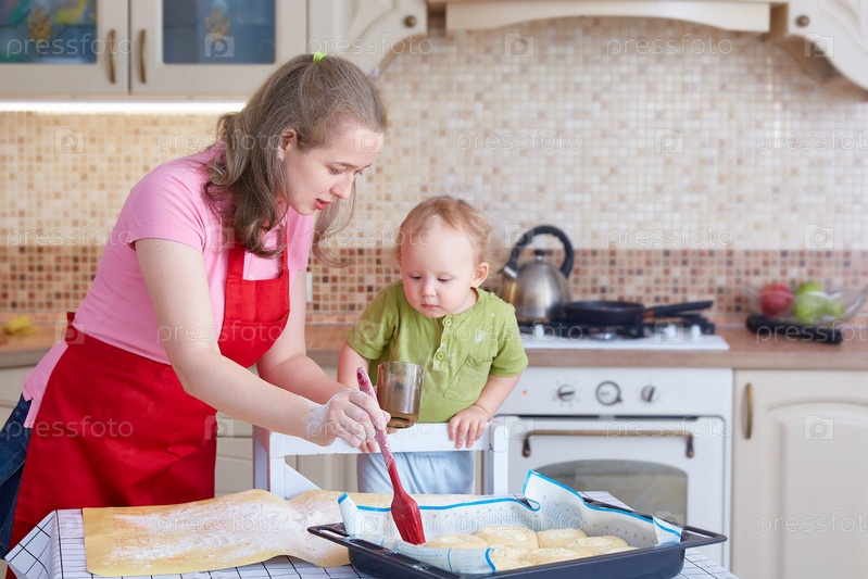 Молодая женщина учит ребенка готовить пирожные. Смазывает пироги на противне кулинарной кисточкой