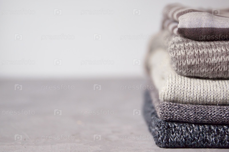 Серые свитера сложены на сером фоне. Копировать пространство