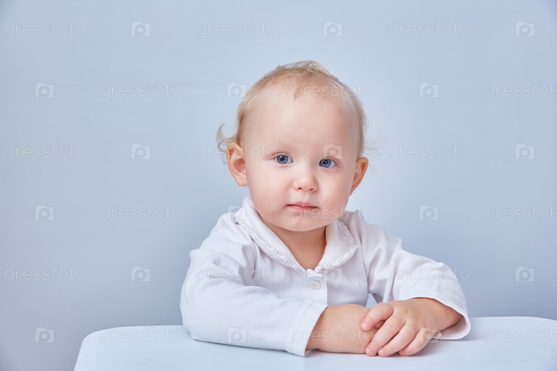 Портрет ребенка в светлой одежде, сидящего за столом на светлом фоне