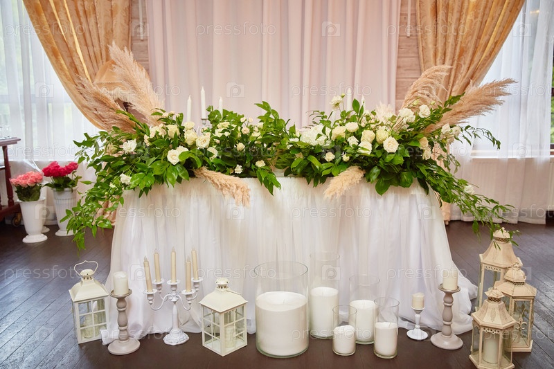 Свадебный стол украшен свечами и цветами