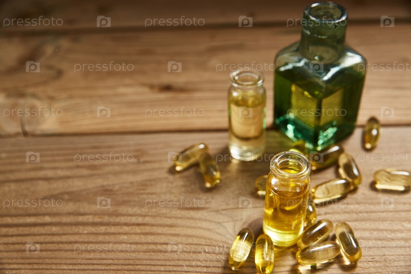 Капсулы и бутылочки с рыбьим жиром Омега-3 лежат на деревянном столе