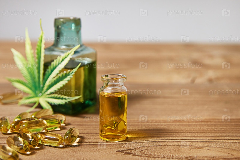 Лекарственная конопля с экстрактом масла в бутылке на деревянном фоне, концепция здравоохранения, пустое пространство для дизайна