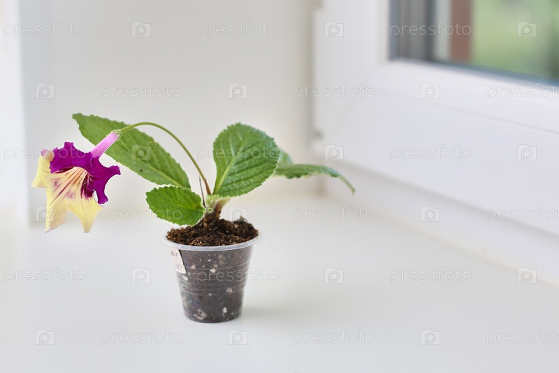 Красно-желтый стрептокарпус в пластиковом горшке на окне