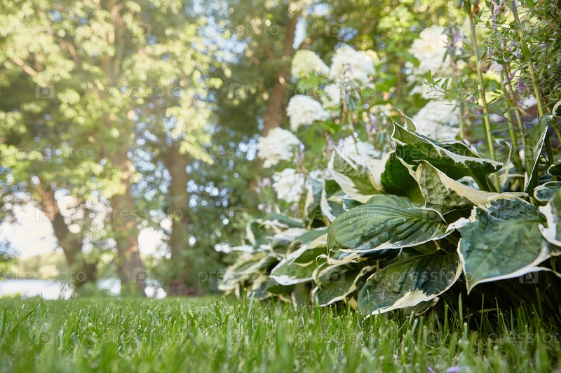 Клумба крупным планом с гортензией метельчатой крупноцветковой и двухцветной хостой с белой каймой. Лилейники