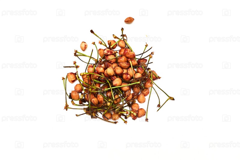 Косточки и стебли черешни на белом фоне