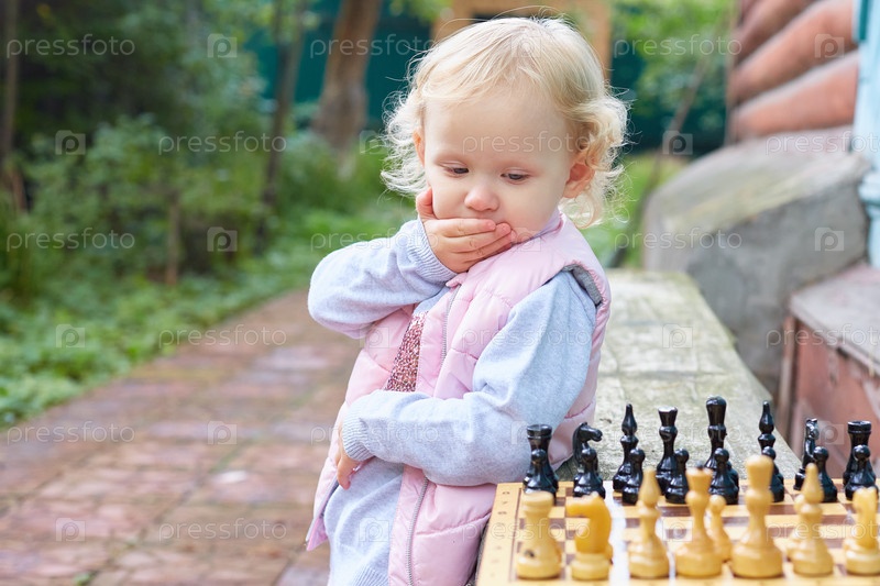 Умная маленькая девочка играет в шахматы. Концепция развития, обучения и образования. Копировать пространство