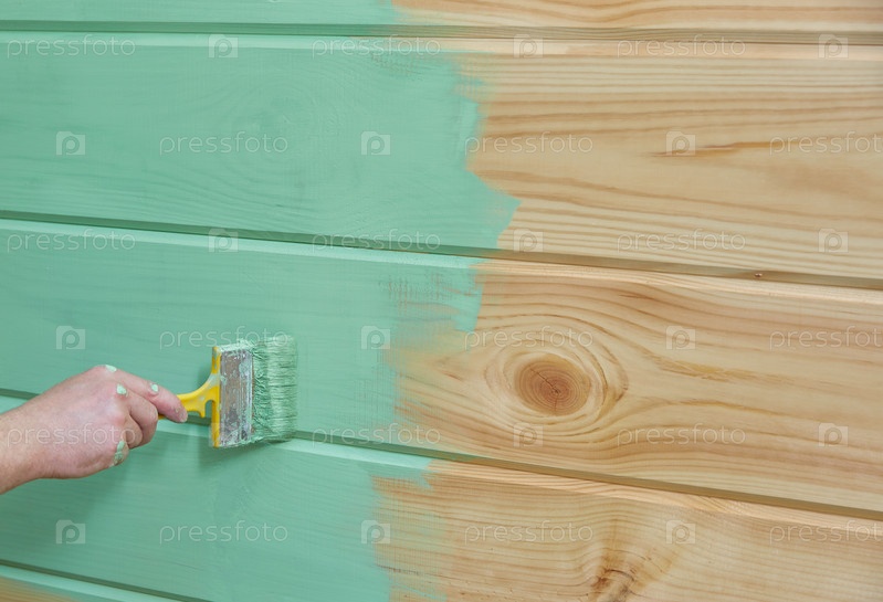 Вручную красит деревянную вертикальную поверхность зеленой краской
