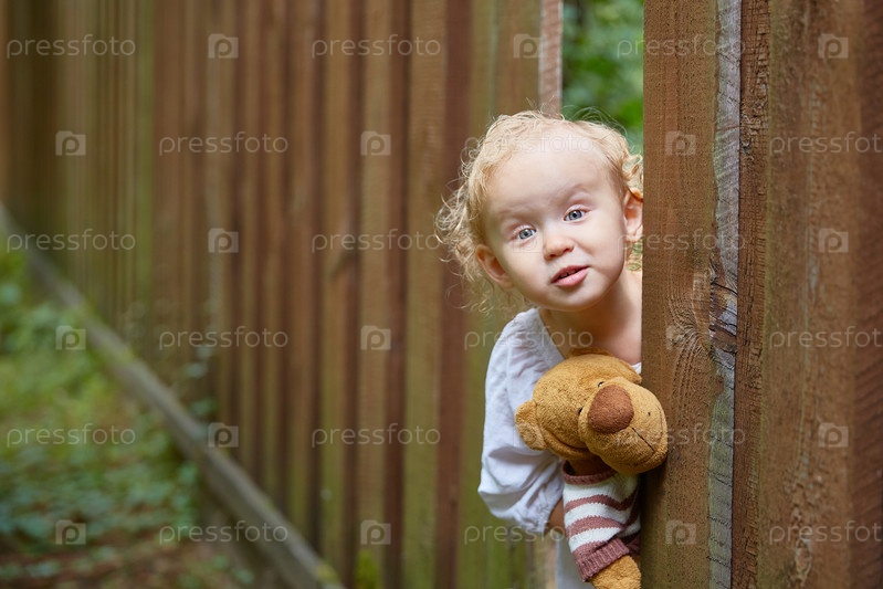 Девочка с плюшевым мишкой в руках смотрит через дыру в деревянном заборе. Копировать пространство