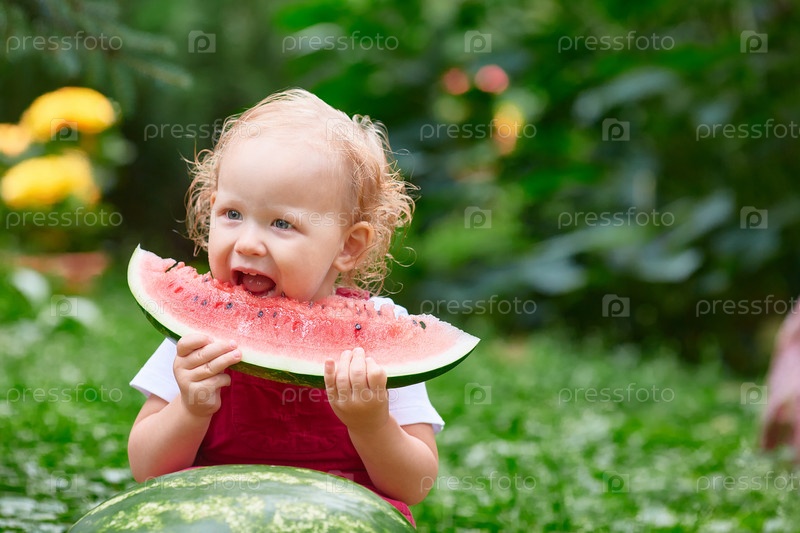 Кудрявый малыш ест арбуз, сидя на зеленой траве в саду с цветами летним днем