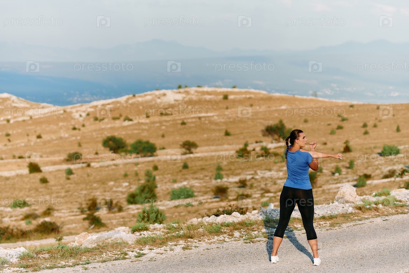 Решительная спортсменка делает растяжку после интенсивной пробежки по пересеченной горной местности