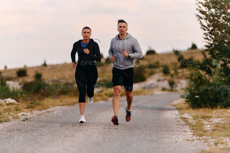 Пара в спортивной одежде бежит по живописной дороге во время утренней тренировки, наслаждаясь свежим воздухом и поддерживая здоровый образ жизни