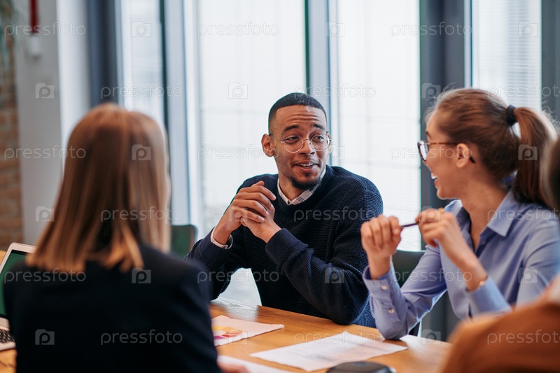 В яркой атмосфере современного офиса стартапа разнообразная команда профессионалов в сфере бизнеса участвует в обсуждениях различных проектов и разрабатывает новые бизнес-стратегии, олицетворяя креативность и инновации в предпринимательской среде