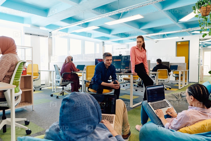 В современном офисе стартапа разнообразная группа молодых и способных бизнесменов ведет оживленные обсуждения различных проектов, демонстрируя командную работу, инновации и предпринимательский дух