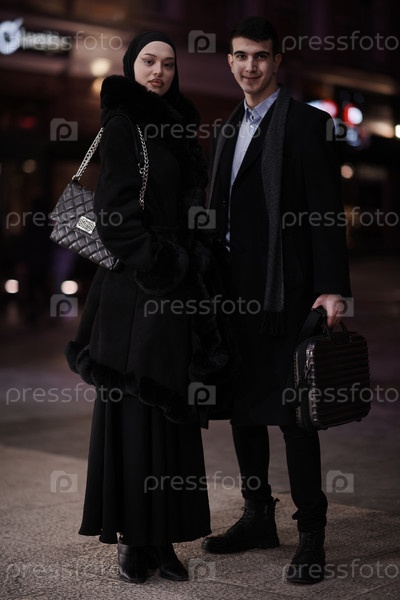 Счастливая мультикультурная деловая пара прогуливается вместе на улице города ночью возле витрины ювелирного магазина
