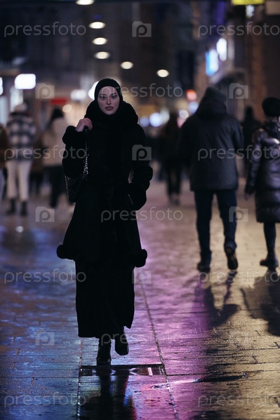 Мусульманка идет по городской улице холодной зимней ночью в хиджабе