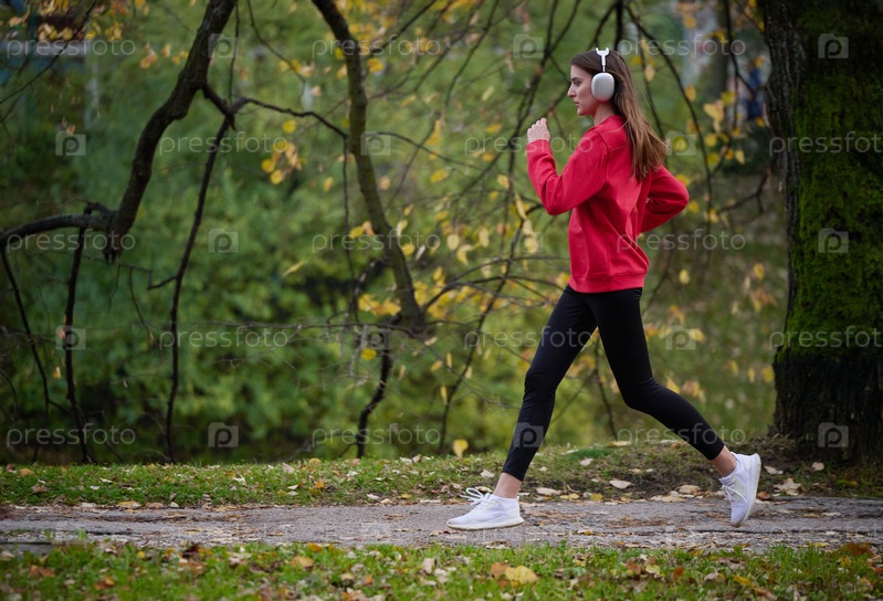 Молодая красивая женщина бежит в осеннем парке и слушает музыку в наушниках на смартфоне