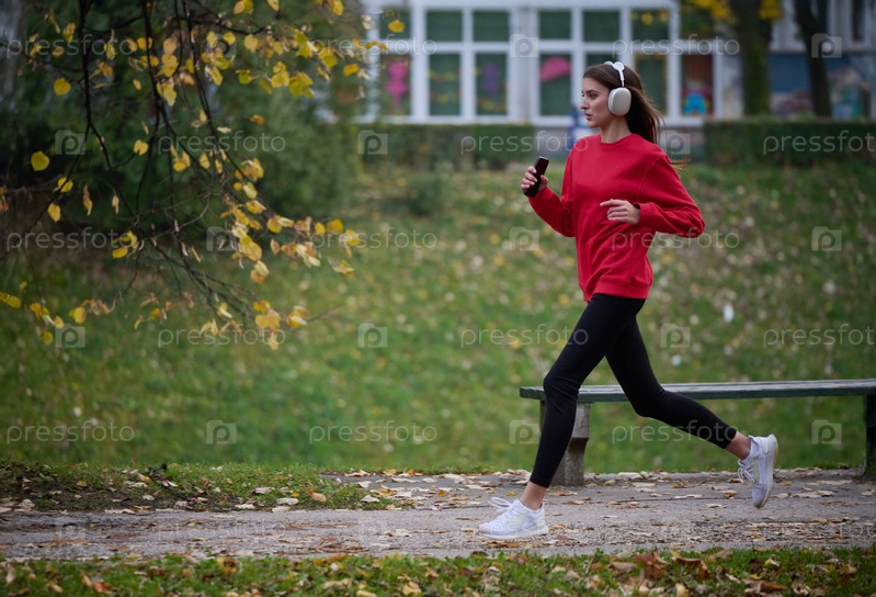 Молодая красивая женщина бежит в осеннем парке и слушает музыку в наушниках на смартфоне