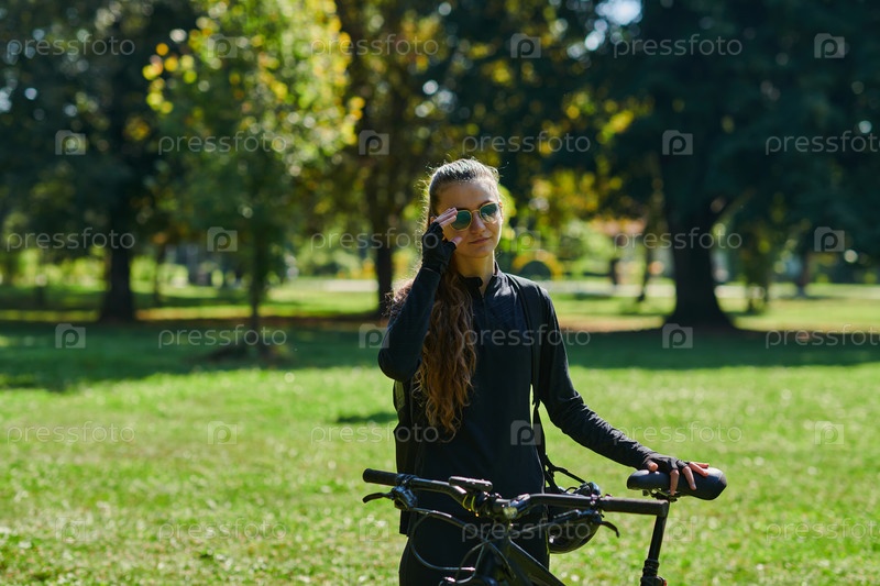 В лучезарных объятиях солнечного дня радостная девушка, облаченная в профессиональную велосипедную экипировку, находит чистое блаженство и жизненную силу, катаясь по парку на своем велосипеде, а ее заразительный смех отражает беззаботную гармонию момента