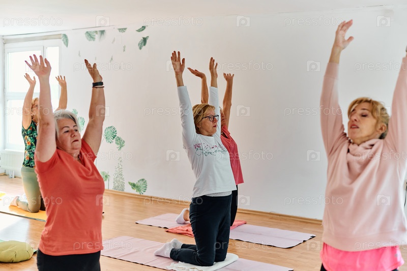 Группа пожилых женщин занимается различными упражнениями йоги, включая растяжку шеи, спины и ног, под руководством тренера в залитом солнцем месте, способствуя благополучию и гармонии