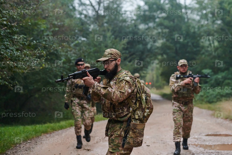 Дисциплинированное и специализированное военное подразделение, облаченное в камуфляж, осуществляющее стратегическое патрулирование и сохраняющее контроль в обстановке с высокими ставками, демонстрирующее свою точность, сплоченность и готовность к специаль