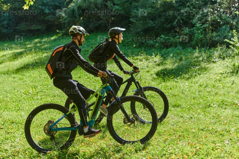 Счастливая пара, одетая в профессиональную велосипедную экипировку, наслаждается романтической велопрогулкой по парку, окруженному современными природными достопримечательностями, излучая любовь и счастье