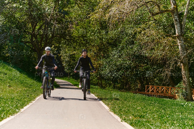 Счастливая пара, одетая в профессиональную велосипедную экипировку, наслаждается романтической велопрогулкой по парку, окруженному современными природными достопримечательностями, излучая любовь и счастье