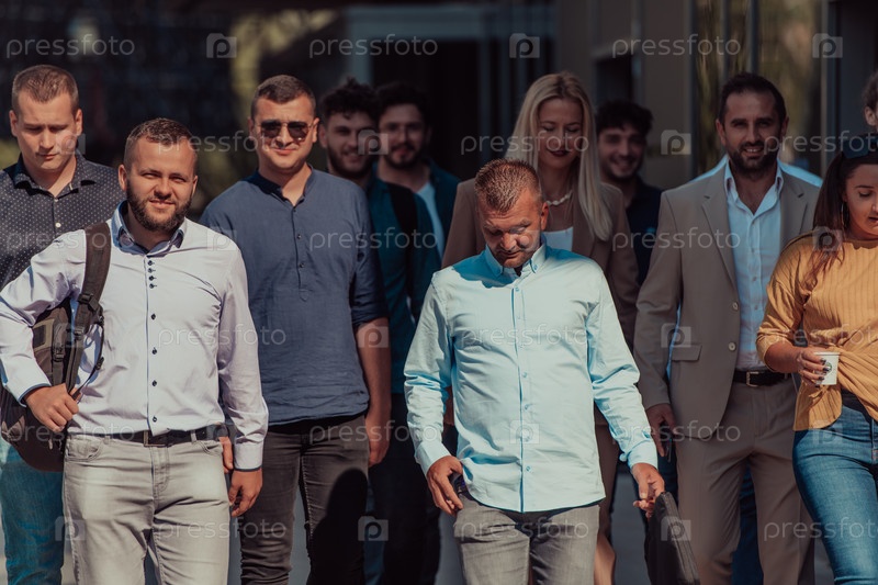 Группа бизнесменов и коллег из разных слоев общества прогуливается по своему рабочему месту, демонстрируя сотрудничество и командную работу в компании