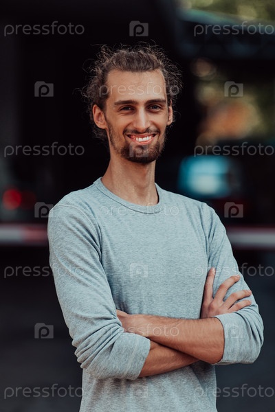 Портрет молодого успешного бизнесмена со скрещенными руками перед компанией